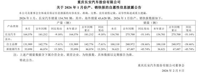 官方最新产销快报数据显示,2026年1月份,长安汽车单月销量为134701台,同比下滑51.14%。显然,从长安汽车公布的销量数据来看,2026年1月份,长安汽车的单月销量呈现出较大幅度的下滑态势。