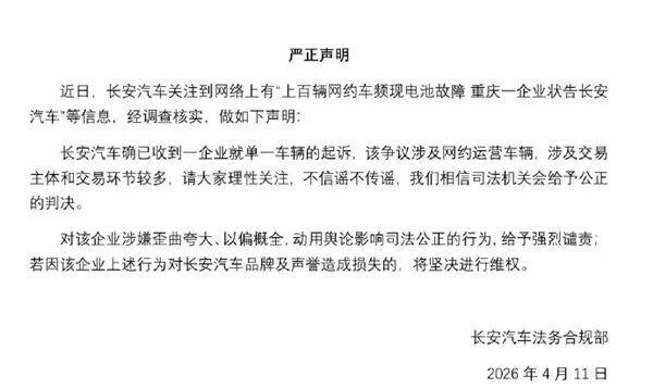 长安汽车在声明中强调该争议“涉及网约运营车辆,涉及交易主体和交易环节较多”,并“对该企业涉嫌歪曲夸大、以偏概全,动用舆论影响司法公正的行为,给予强烈谴责”。