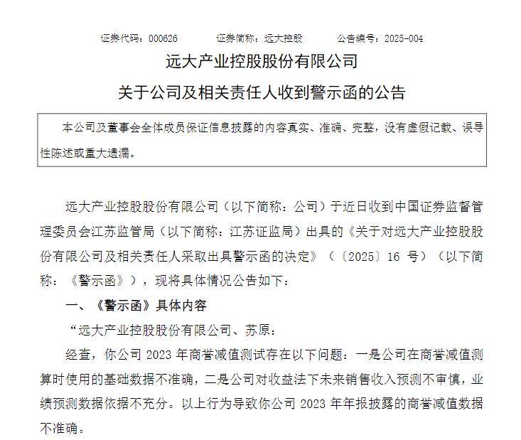 警示函指出,远大控股在2023年商誉减值测试中存在基础数据不准确、销售收入预测不审慎等问题,导致年报披露的商誉减值数据不准确。