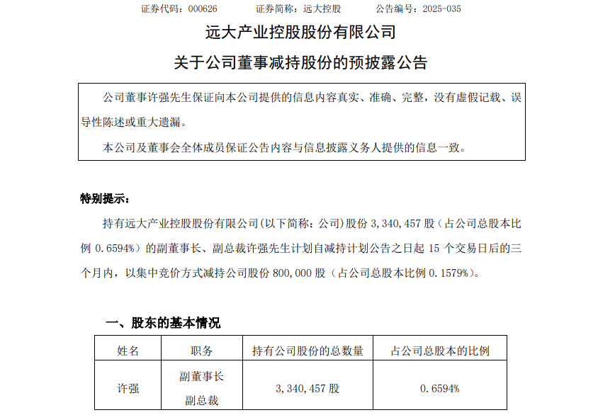 8月10日,远大控股(000626)发布公告称,持有远大产业控股股份有限公司股份约 334 万股(占公司总股本比例为 0.6594%)的副董事长、副总裁许强计划自减持计划公告之日起 15 个交易日后的三个月内,以集中竞价方式减持公司股份 80 万股(占公司总股本比例为 0.1579%)。