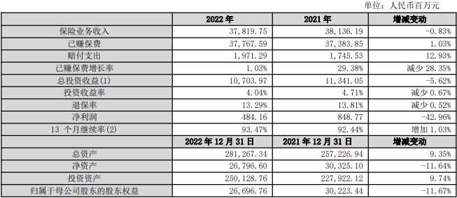 2022年,国华人寿实现总投资收益107.04亿元,同比减少5.62%;年化净投资收益率为4.04%,较上年同期减少0.67个百分点。