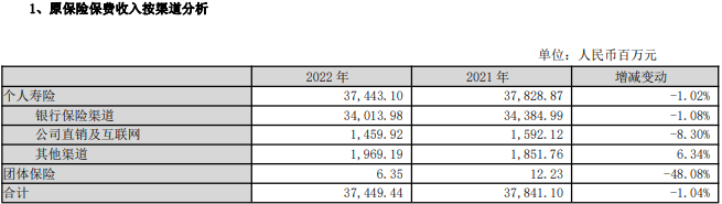 2022年,国华人寿个人寿险实现原保险保费收入374.43亿元,同比下降1.02%。其中,银行保险渠道实现原保险保费收入340.14亿元,同比下降1.08%;公司直销及互联网业务原保险保费收入14.60亿元,同比下降8.30%;其他渠道原保险保费收入19.69亿元,同比增长6.34%。