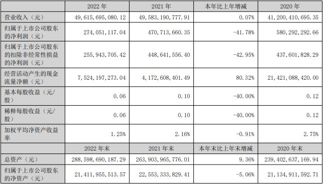 中国经济网北京4月24日讯天茂集团(000627.SZ)于4月21日晚间披露2022年年度报告。报告期内,天茂集团实现营业收入496.16亿元,同比增长0.07%;实现归属于上市公司股东的净利润2.74亿元,同比下降41.78%;实现归属于上市公司股东的扣除非经常性损益的净利润2.56亿元,同比下降42.95%;经营活动产生的现金流量净额75.24亿元,同比增长80.32%。