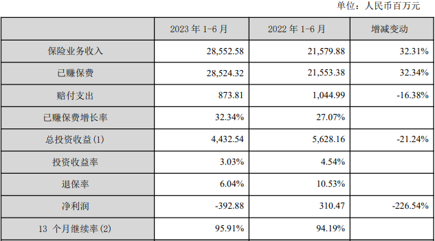 2023年上半年,国华人寿保险业务收入为285.53亿元,同比增长32.31%;已赚保费为285.24亿元,同比增长32.34%;原保险保费收入为283.77亿元,同比增长32.69%;赔付支出8.74亿元,同比下降16.38%;净利润为-3.93亿元,同比下降226.54%;退保率为6.04%,上年同期为10.53%;13个月继续率为95.91%,上年同期为94.19%。
