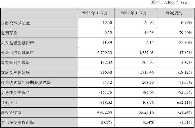2023年上半年,国华人寿总投资收益为44.33亿元,同比下降21.24%;年化净投资收益率为3.03%,上年同期为4.54%。