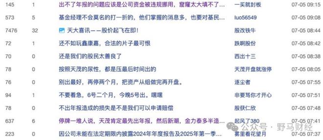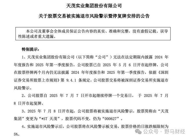7月6日公告显示,因公司无法在法定期限内披露2024年年度报告和2025年第一季度报,天茂集团股票将披星戴帽。