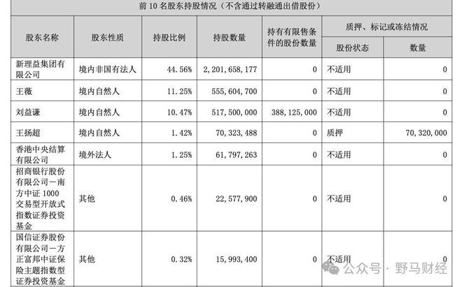 截至2024年三季度,新理益集团持有天茂集团44.56%股权,此外刘益谦直接持股10.47%,其妻子王薇直接持股11.25%。而新理益集团又由刘益谦、刘天超、刘妍超各自持股88.6%、10%、1.37%。