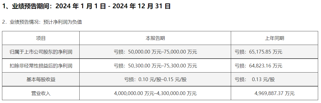 2023年,天茂集团出现近十年首次亏损。数据显示,2023年亏损6.52亿元,同比下降337.82%。2024年业绩预告显示,天茂集团预计营收400亿元-430亿元,同比下滑13.48%-19.52%;归母净利润预计亏损5亿元-7.5亿元。天茂集团称,2024年,利率市场环境持续走低,国华人寿受国债收益率下行影响,增加计提准备金,造成亏损。