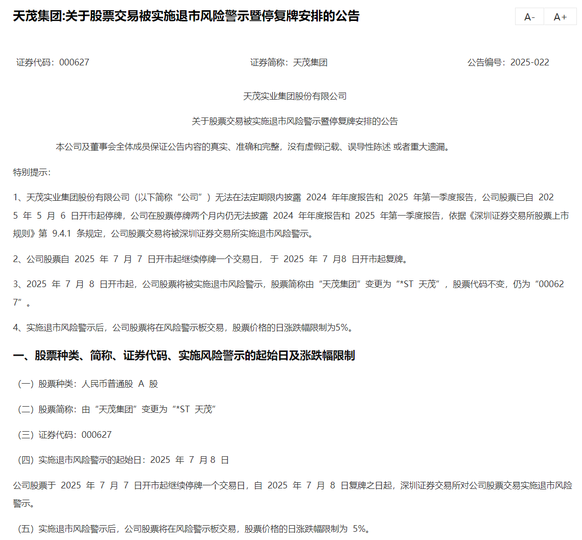 天茂集团称,公司股票将自2025年7月7日开市起继续停牌一个交易日,于2025年7月8日开市起复牌,股票简称由“天茂集团”变更为“*ST天茂”,股票代码不变,仍为“000627”。实施退市风险警示后,公司股票将在风险警示板交易,股票价格的日涨跌幅限制为5%。