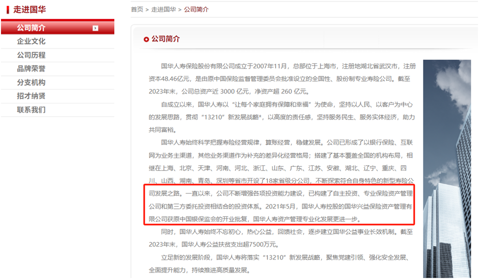 从国华人寿官网的公司简介可以看到,“一直以来,公司不断增强各项投资能力建设,已构建了自主投资、专业保险资产管理公司和第三方委托投资相结合的投资体系。”