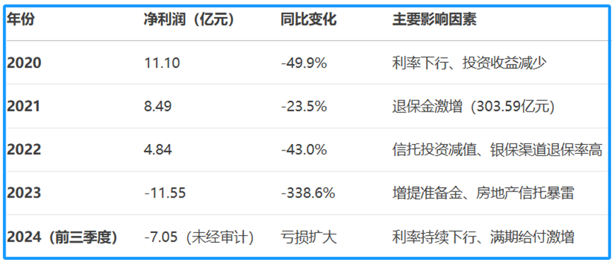 根据中国银保监会要求披露的国华人寿2024年第三季度偿付能力报告,2024年前三季度,国华人寿净亏损为7.05亿元(未经审计),相比2023年同期亏损5.52亿元进一步扩大。