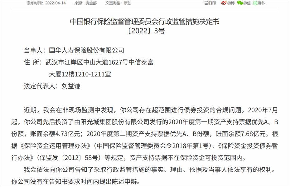 2025年天茂集团因年报“难产”被证监会立案调查;2023年原银保监会在检查时就曾发现,国华人寿百亿元级保险资金被违规运用,涉及房地产、未上市公司股权及艺术品投资;2022年4月,国华人寿也因投资阳光城集团股份有限公司发行的资产支持票据而收到原银保监会的行政监管措施决定书,要求及时整改超范围投资问题。