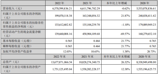 高新发展2022年营业收入为65.71亿元,同比下降0.62%;归属于上市公司股东的净利润为1.99亿元,同比增长21.87%;归属于上市公司股东的扣除非经常性损益的净利润为1.34亿元,同比下降1.10%;经营活动产生的现金流量净额为1.40亿元,同比减少69.57%。