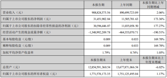 高新发展2023年第一季度营业收入为9.09亿元,同比增长2.06%;归属于上市公司股东的净利润为3145.19万元,同比增长173.36%;归属于上市公司股东的扣除非经常性损益的净利润为3059.64万元,同比增长177.27%;经营活动产生的现金流量净额为-13.49亿元,上年同期为-4.64亿元。