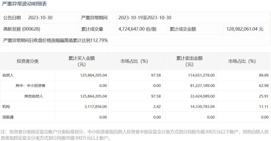 2023年10月30日晚间,深交所披露,高新发展(000628.SZ)10月19日至10月30日期间累计上涨114%,在这一个涨幅严重异常期间,自然人买入1.26亿元,占比97.58%。机构投资者买入312万元,占比2.42%。