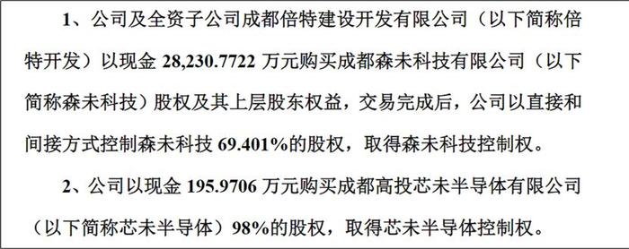 2022年6月,公司支付现金28,230万及196万,分别取得森未科技及芯未半导体69%和98%的股权,正式切入功率半导体业务。