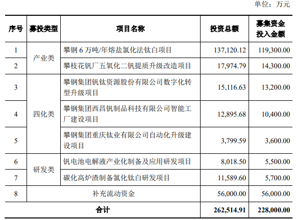 此次预计募资不超22.8亿元,用于攀钢6万吨/年熔盐氯化法钛白项目、攀枝花钒厂五氧化二钒提质升级改造项目、攀钢集团钒钛资源股份有限公司数字化转型升级项目、攀钢集团西昌钒制品科技有限公司智能工厂建设项目、攀钢集团重庆钛业有限公司自动化升级建设项目、钒电池电解液产业化制备及应用研发项目、碳化高炉渣制备氯化钛白研发项目和补充流动资金。