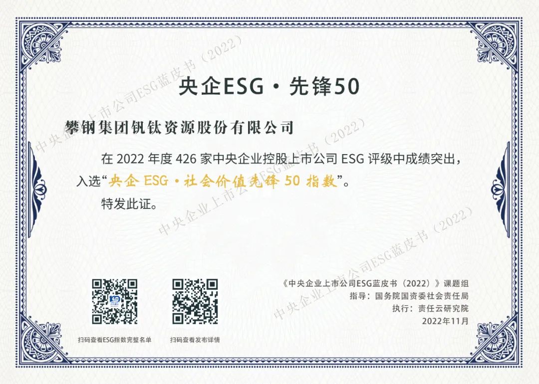 ▲2022年11月,钒钛股份成功入选“央企ESG·社会价值先锋50指数”,该指数是由国务院国资委社会责任局指导、中国社会责任百人论坛(ESG专家委员会)以426家中央企业控股上市公司为评价对象,根据企业在社会价值的具体表现,筛选位列前50家企业所形成。