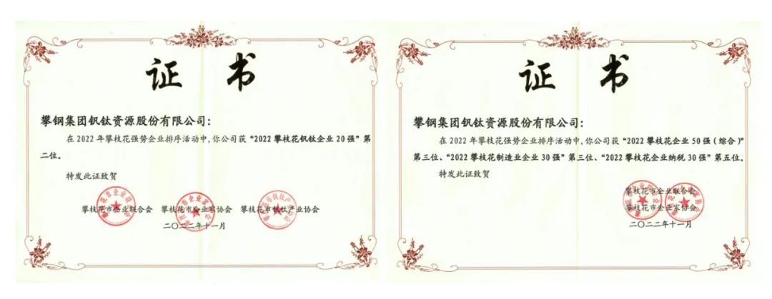 ▲钒钛股份获评“2022攀枝花钒钛企业20强”“2022攀枝花企业50强(综合)”“2022攀枝花制造业企业30强”“2022攀枝花企业纳税30强”。