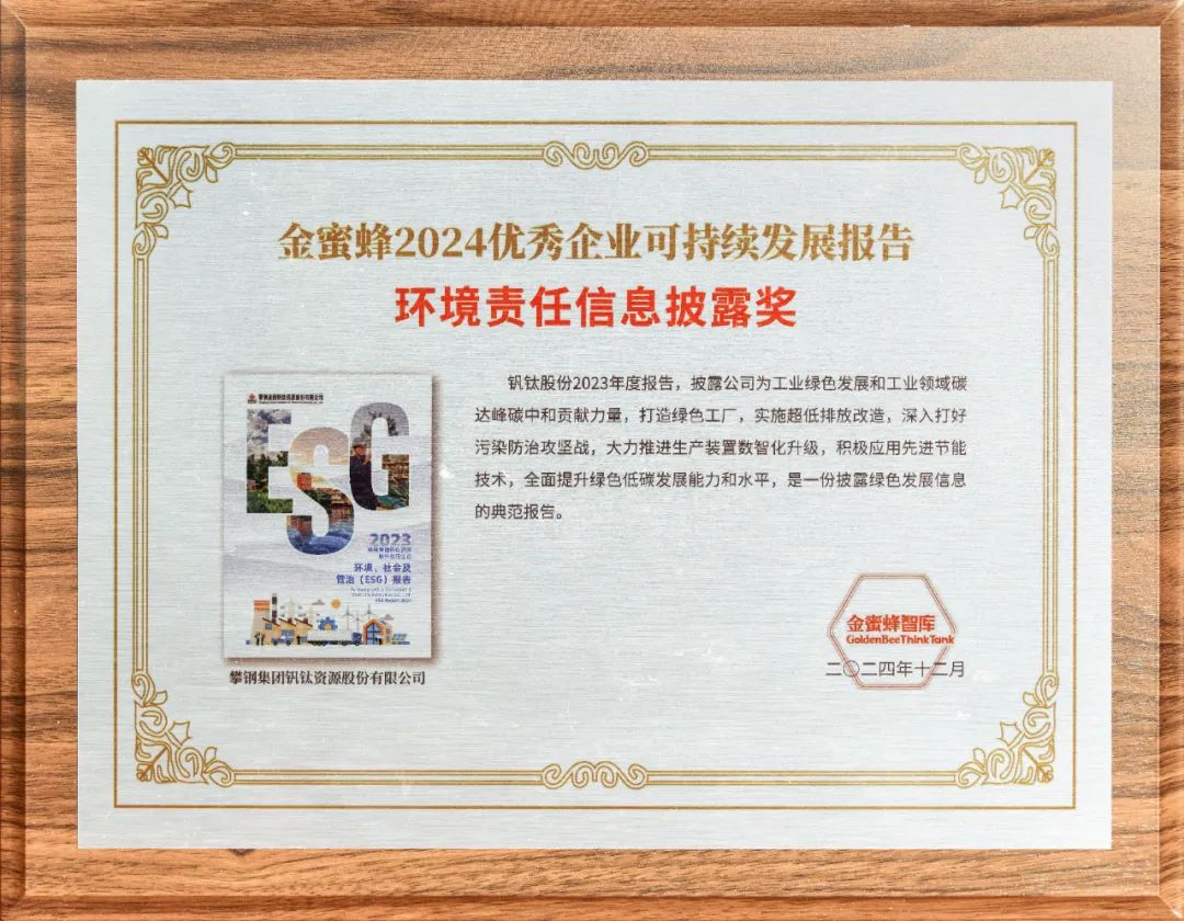 近日,在第十七届中国可持续信息披露国际研讨会上,“金蜜蜂2024优秀企业可持续发展报告·中国榜”隆重揭晓。钒钛股份荣获“环境责任信息披露奖”。