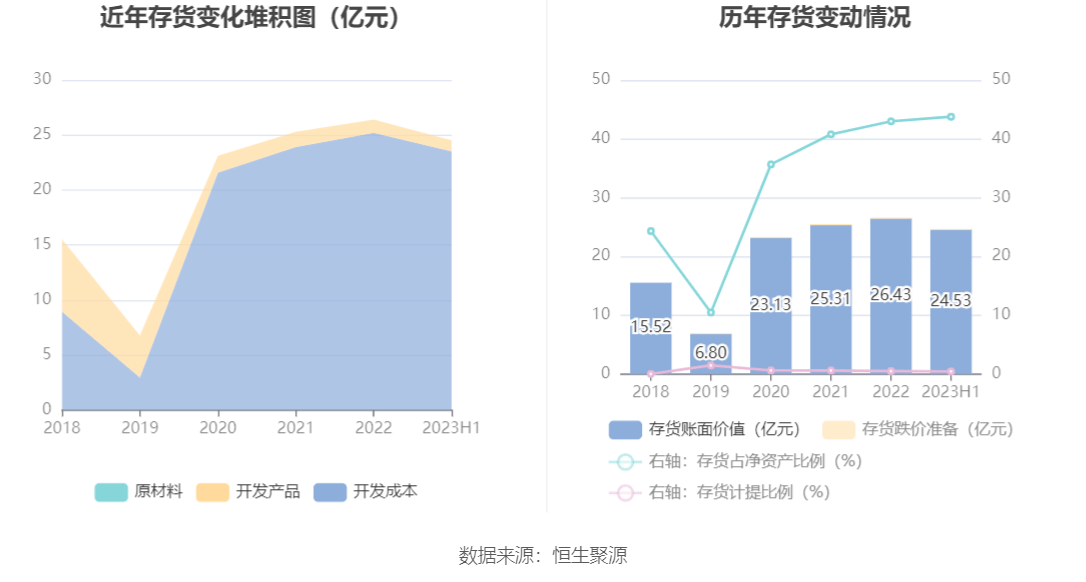 从存货变动来看,截至2023年上半年末,公司存货账面价值为24.53亿元,占净资产的43.76%,较上年末减少1.9亿元。其中,存货跌价准备为1029.08万元,计提比例为0.42%。
