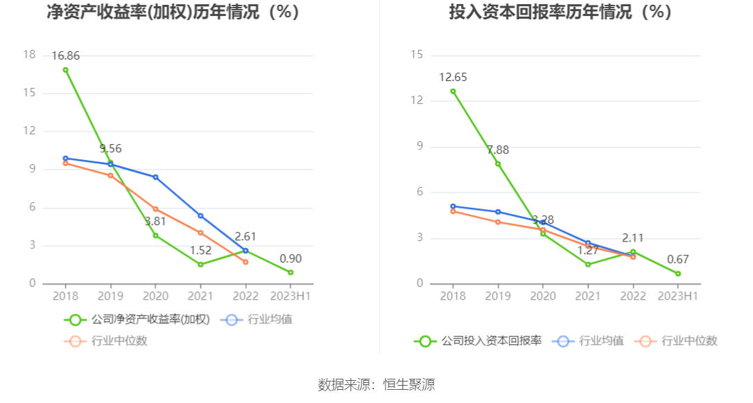 数据显示,2023年上半年公司加权平均净资产收益率为0.90%,较上年同期下降0.46个百分点;公司2023年上半年投入资本回报率为0.67%,较上年同期下降0.30个百分点。
