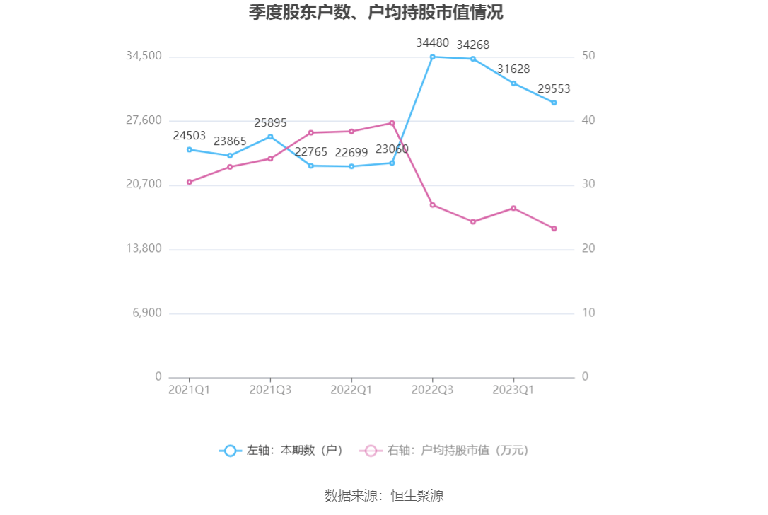 筹码集中度方面,截至2023年二季度末,公司股东总户数为2.96万户,较一季度末下降了2075户,降幅6.56%;户均持股市值由一季度末的26.38万元下降至23.21万元,降幅为12.02%。