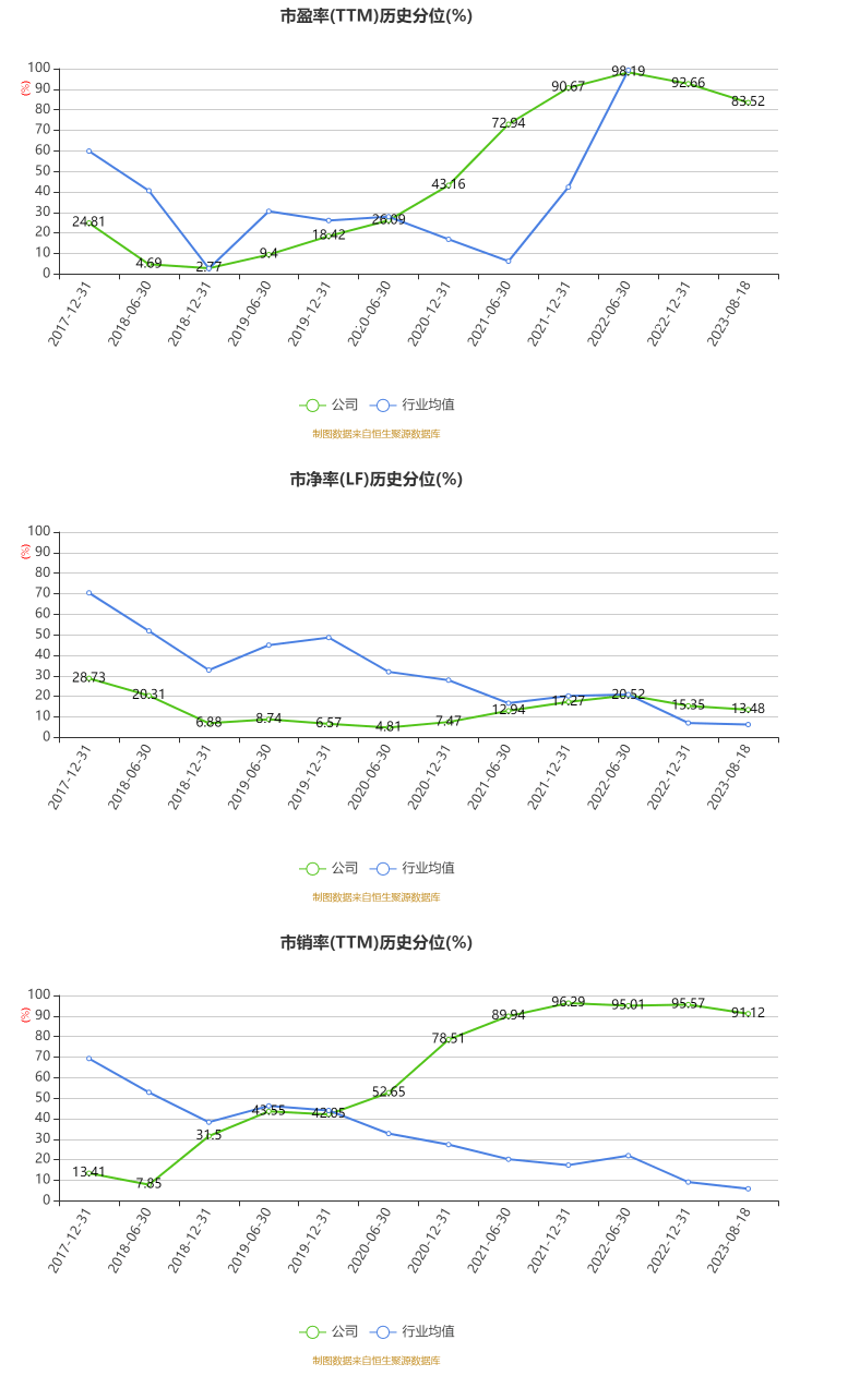 公司近年市盈率(TTM)、市净率(LF)、市销率(TTM)历史分位图如下所示: