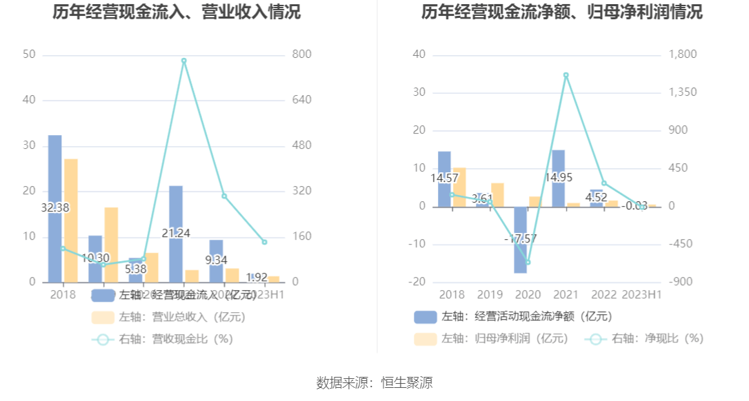 2023年上半年,公司营业收入现金比为141.85%,净现比为-5.58%。