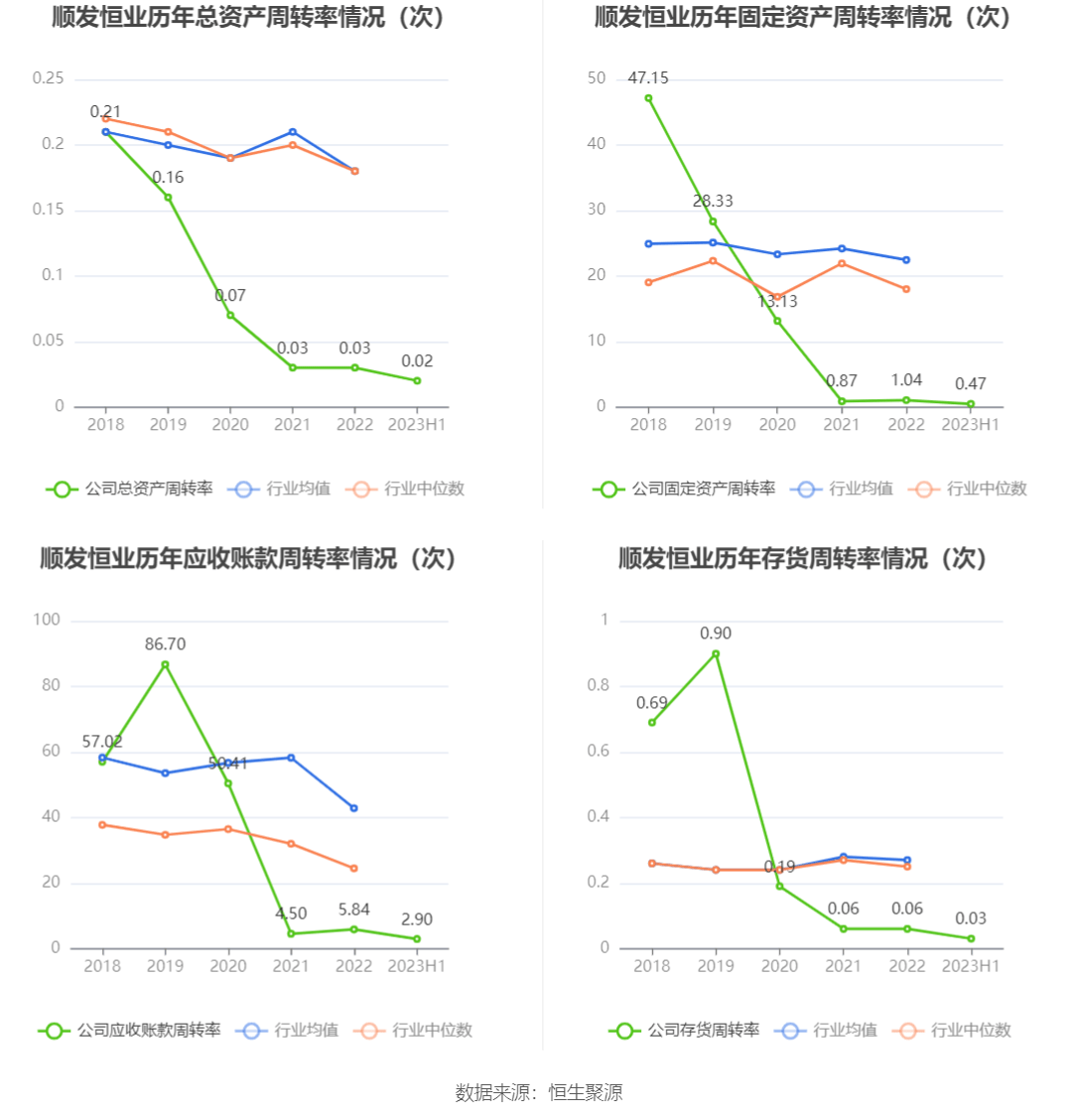 营运能力方面,2023年上半年,公司总资产周转率为0.02次,上年同期为0.01次(2022年上半年行业平均值为0.07次,公司位居同行业84/88);固定资产周转率为0.47次,上年同期为0.43次(2022年上半年行业平均值为8.20次,公司位居同行业81/88);公司应收账款周转率、存货周转率分别为2.90次、0.03次。