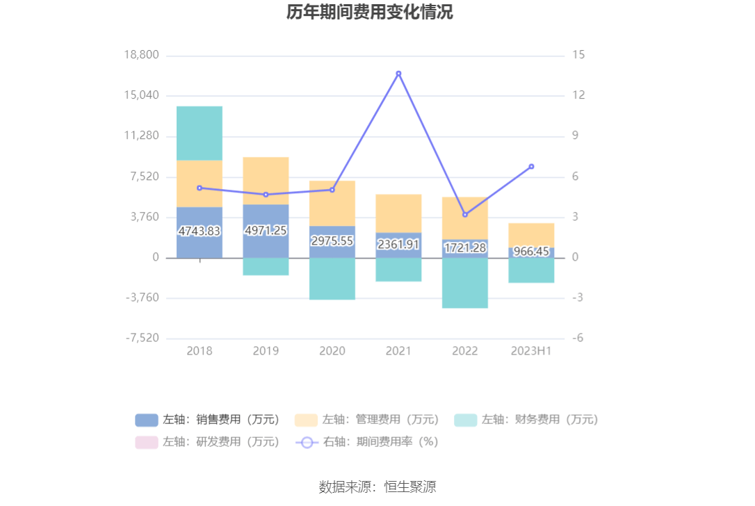 2023年上半年,公司期间费用为918.99万元,较上年同期增加1526.32万元;期间费用率为6.78%,较上年同期上升11.68个百分点。其中,销售费用同比增长38.89%,管理费用同比增长4.81%,财务费用由去年同期的-3466.83万元变为-2315.27万元。