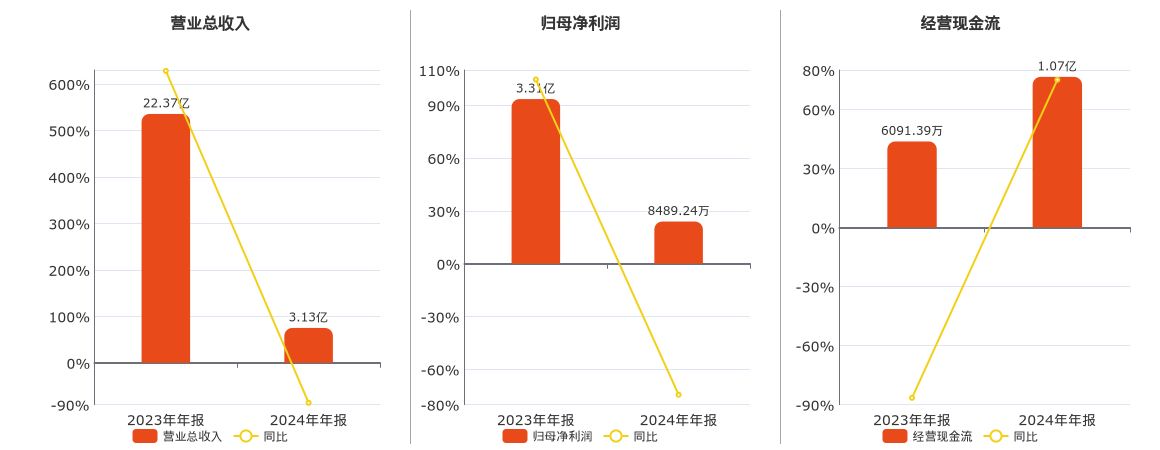 公司营业总收入为3.13亿元,较去年同报告期营业总收入减少19.23亿元,同比较去年同期下降86.00%。归母净利润为8489.24万元,较去年同报告期归母净利润减少2.46亿元,同比较去年同期下降74.38%。经营活动现金净流入为1.07亿元。