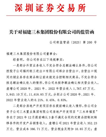 2023年12月31日,深圳证券交易所下发关于对福建三木集团股份有限公司(以下简称“三木集团”或“公司”)的监管函。监管函称,三木集团存在部分外贸业务收入不完全符合总额法确认条件、对外担保信息披露不完整等多项违规事实。