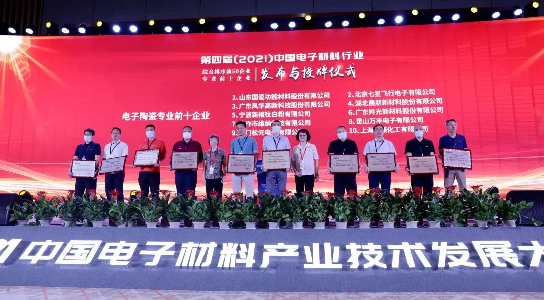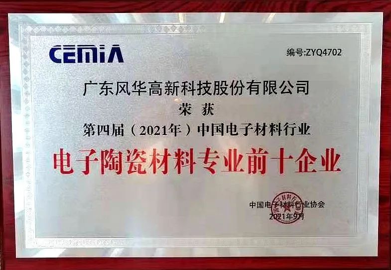 风华高科荣获”第四届中国电子材料行业电子陶瓷材料专业前十企业”