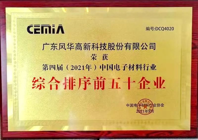 风华高科荣获“第四届中国电子材料行业综合排序前五十企业”
