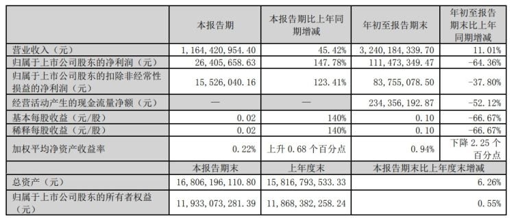 10月20日,风华高科发布三季度业绩公告称,公司2023年前三季度营收约32.4亿元,同比增加11.01%;归属于上市公司股东的净利润约1.11亿元,同比减少64.36%;基本每股收益0.1元,同比减少66.67%。