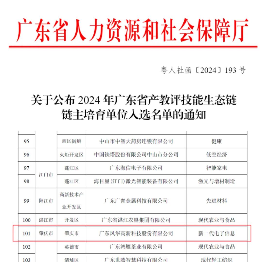 近日,广东省人力资源和社会保障厅公布了《2024年广东省产教评技能生态链链主培育单位名单》,风华高科成功入选,是肇庆市第一家,标志着公司在“新培养、新就业、新动能”人才发展方面持续向前跨步,进一步筑牢了现代化产业专业技能人才根基,助力现代化高质量发展。