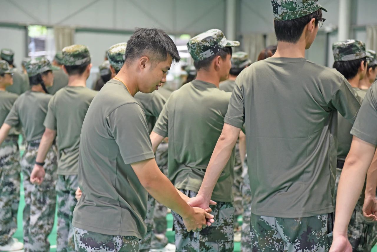 在持续了近两周的军训时光里,“新兵”们在教官的指导下逐一练习站军姿、喊口号等动作。“两脚分开六十度,两腿挺直,大拇指贴于食指第二关节,两手自然下垂贴紧!”。