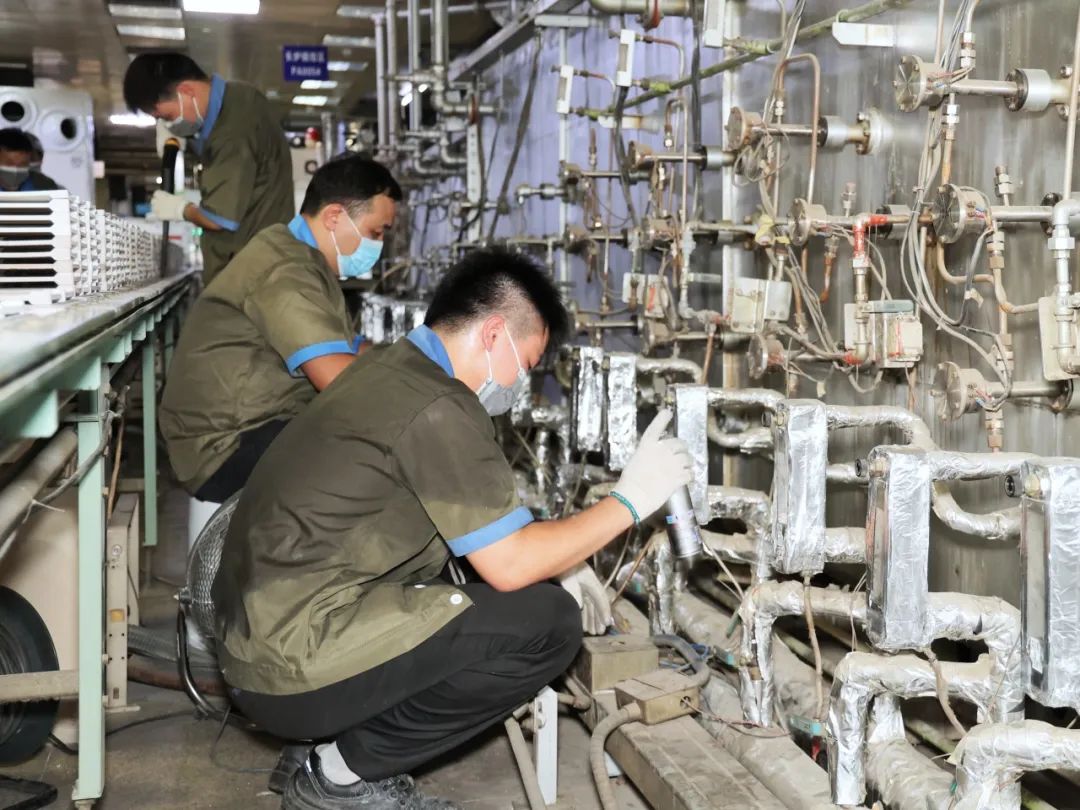 为保证生产设备在高温下正常运作,保障产品质量和生产效率,设备技术人员顶着滚烫热浪,对高温设备进行例行检测及保养,每天完成1条炉子的保养任务,确保产线高产出率。面对高温难耐的恶劣环境,设备技术人员即使汗流浃背,仍然干劲十足。