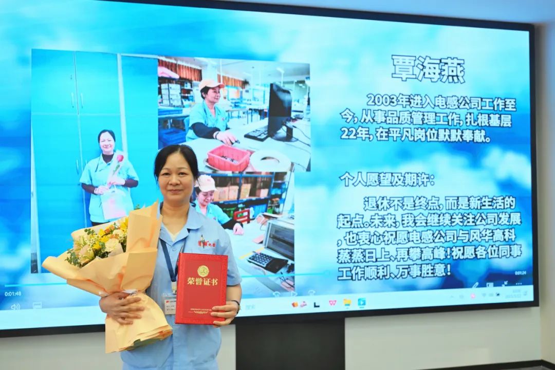 覃海燕:入职风华22年,曾任职轴向车间、传感器车间。22年的职业生涯里,最珍贵的是与大家并肩奋斗的情谊。从跟着老师傅学习基本焊接操作,到逐渐熟练掌握各项专业技能,成为一名质量检验员,每一步都离不开同事的帮助。感谢公司领导的悉心栽培与信任,让我在岗位上不断成长,这份知遇之恩我将铭记于心,也感谢同事们一直以来的支持与帮助,让我在工作中充满动力。退休不是终点,而是新生活的起点。未来,我会继续关注公司发展,也衷心祝愿风华高科勇创佳绩、再攀高峰!