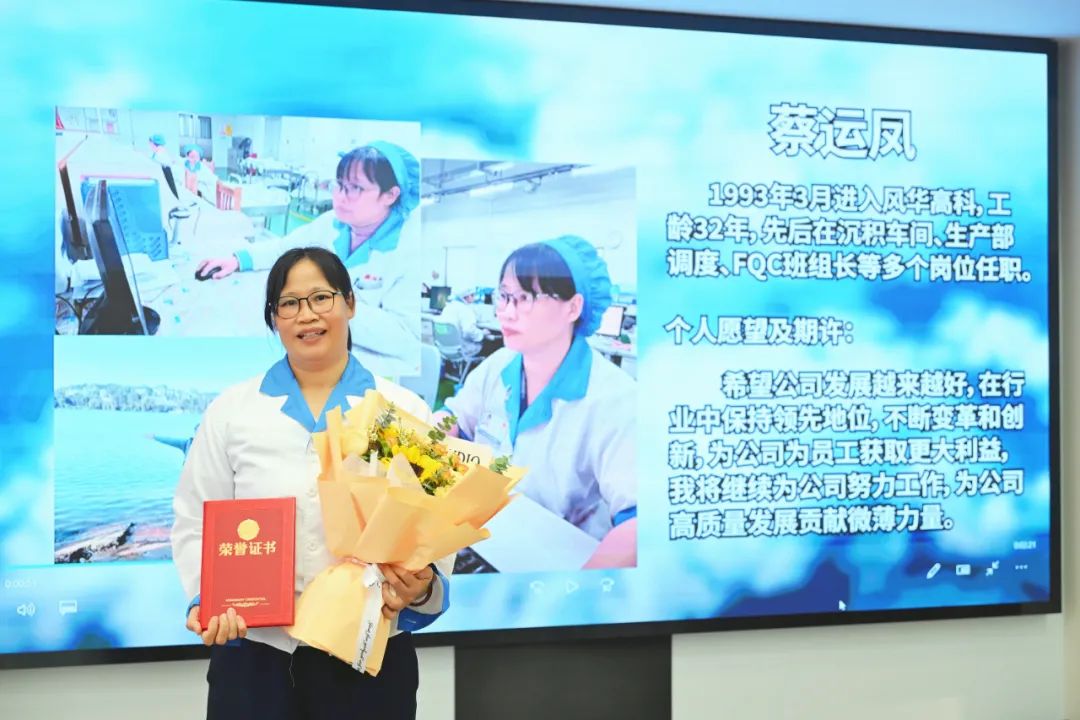 黄子芬:入职风华14年,任职于公司工衣洗衣房。14 年来,我每日重复着清洗、烘干、折叠衣物的工作。这份看似平凡的日常,却让我真切感受到责任与热爱的分量,每一件洗净叠齐的工衣,都是对公司形象的守护,也是与同事们默契配合的见证。洗衣房虽小,却承载着我们对工作的热忱,更让我在平凡中找到了职业价值的归属感。如今退休在即,衷心祝愿同事们在风华的平台上继续追逐梦想,成就更好的自己;愿公司在未来的征程中勇攀高峰,持续引领行业标杆!