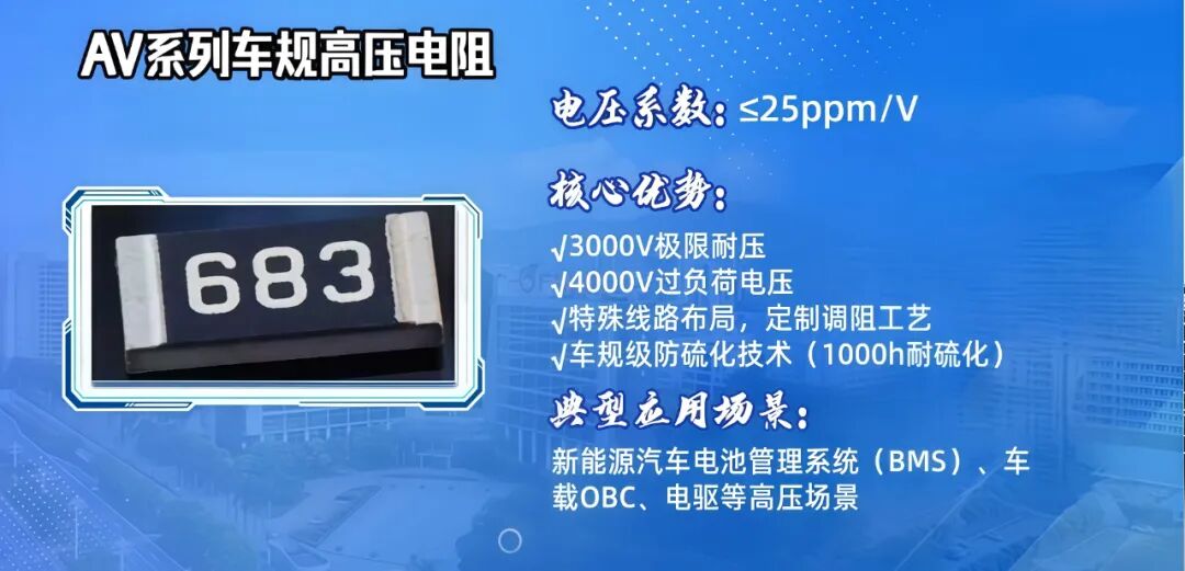 AV系列车规高压电阻:该产品突破了常规车规电阻的耐压极限,通过创新的线路布局设计、定制化调阻工艺及车规级防硫化技术,在新能源汽车电池管理系统、车载充电器及电驱系统等高压高频应用场景中,仍能保持卓越的电气稳定性与耐久性。