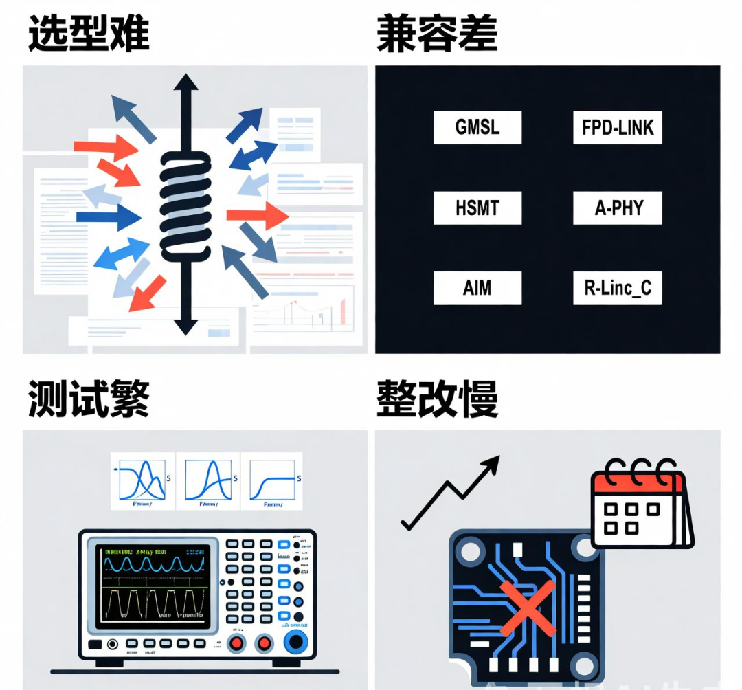 ?兼容差: GMSL、FPD-Link、HSMT等主流芯片协议层出不穷,各协议对S参数频率响应要求各异,方案难以通用,设计周期长。