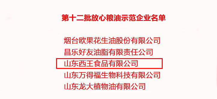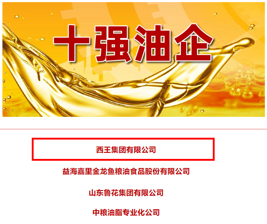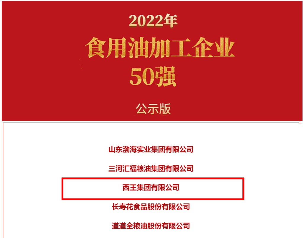 中国粮食行业协会9月20日公示了2022年度粮油加工企业“50强”、“10强”名单,西王集团凭借粮油加工雄厚实力,再次顺利入选中国食用油加工企业“50强”、玉米油加工企业“10强”;同时西王食品依托在食用油领域一贯的优质健康绿色安全特性,荣评“第十二批全国性放心粮油示范企业”,再次彰显了西王食用油的高端健康放心品质。