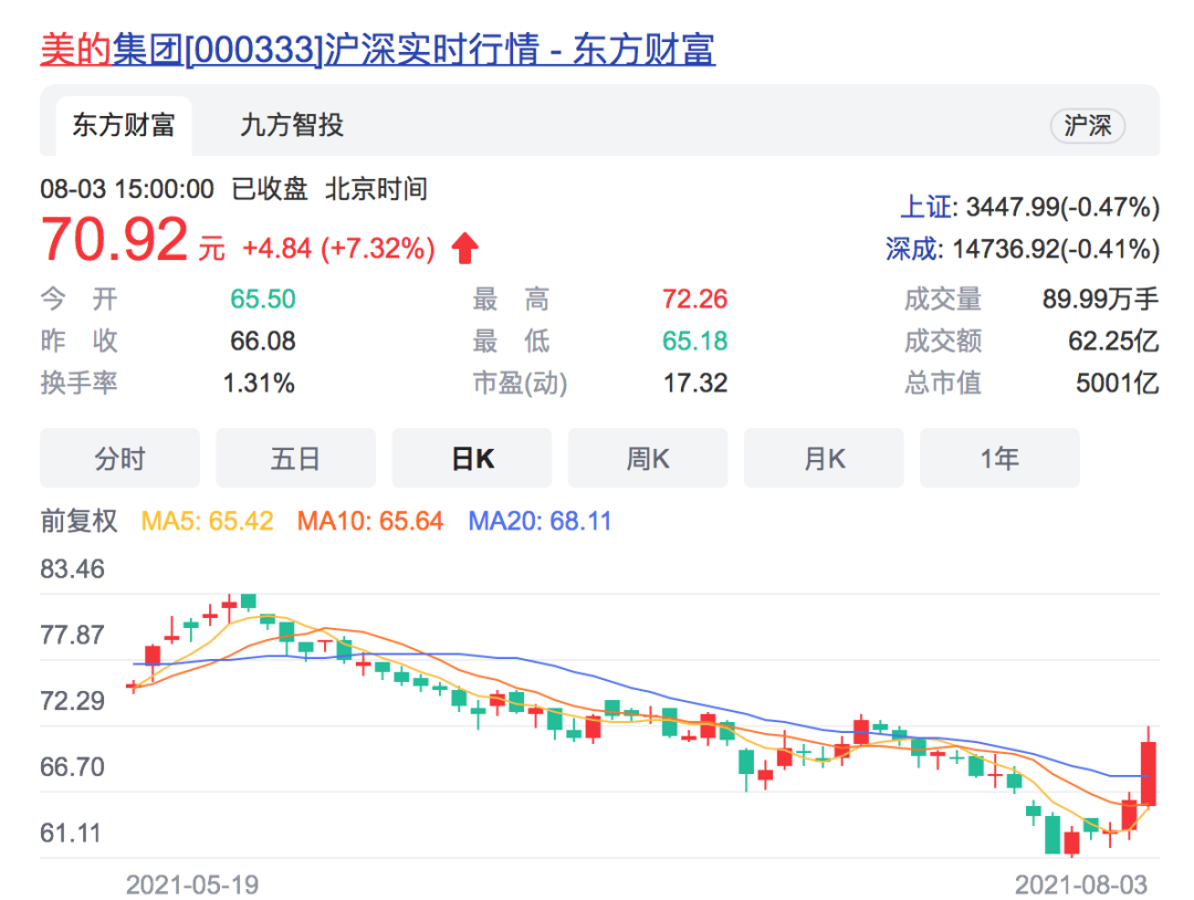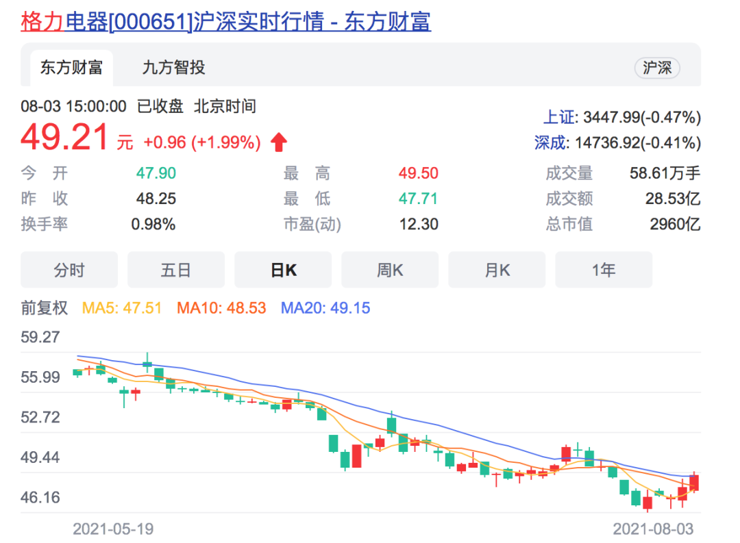 虽然股价一路走低,但最近几个交易日,格力电器股价已有所反弹,8月2日、3日,格力电器分别上涨1.58%和1.99%。相比之下,“隔壁家”的美的集团(000333)反弹力度似乎更为强劲,8月2日、3日分别上涨了4.05%和7.32%。