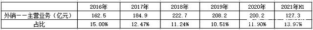 可以看到,2016年公司主营业务的外销收入为162.5亿元,占营业收入的比重为15%;但是到2020年,这一比重不升反降至11.9%,即便今年上半年也没有达到2016年的水平。