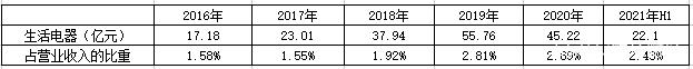 今年上半年,公司“生活电器”的收入为22.1亿元,占整体营业收入的比重为2.43%,较2019年和2020年继续下滑。也就是说,公司的“生活电器”业务不仅没有取得进步反而还在退步,相关多元化业务转型未达到市场预期。