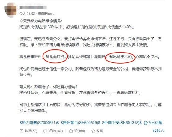 该网友表示:"我担保比例达到130%以下,必须追加担保物保持担保比例至少140%。但现在,我已经身无分文,我打电话给券商求情下话,还是不行,只有被动卖出了一万多股,接下来如果格力电器继续暴跌,我还会继续被强平,直到资不抵债。"