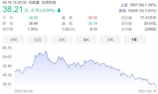 9月16日,格力电器再度大跌2%创年内新低,报38.21元/股,目前总市值2299亿。从去年12月初高位66.79元/股,到目前股价跌幅高达43%,市值缩水1700亿。