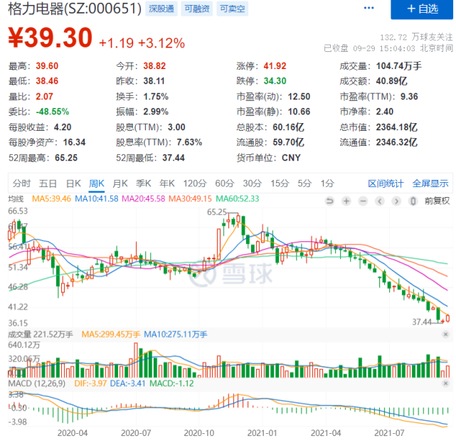 不过遗憾的是,如此真金白银的投入,市场并不买账,格力电器股价下行态势未改,回购价格落在了“山腰”间。